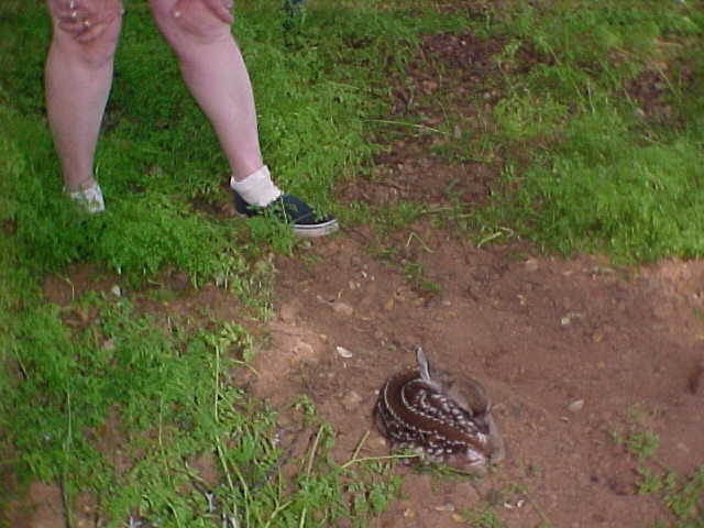 | 1. Rod was on a walk in what we call 'the forest' ( a California Live Oak tree studded area next to our home) when he almost tripped on these two little tiny new-born deer. Our guess is they were only a couple of days old and no mother in site. We were careful NOT to get too close, less our scent should cause the mother to abandon them. This little one had his eyes open but did not move. | ||